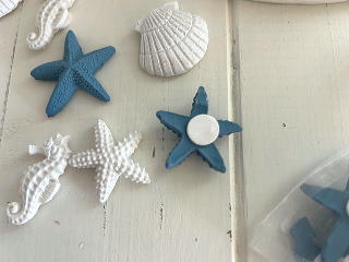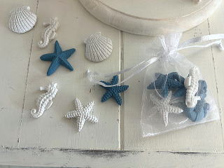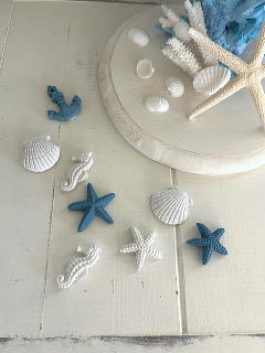 海のアイテムのインテリアパーツ 各裏面に貼り付けテープが付いています インテリア品やカード等に・・・ ヒトデ・イカリ・シェル・タツノオトシゴ アソート計8個 |