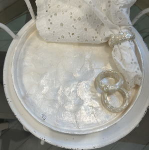 | 丸いカピスシェルを 貼り付けた ラウンドトレイ 輝くシェルが華やか |